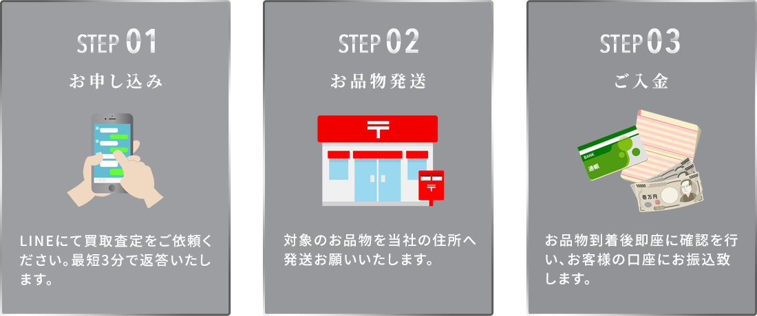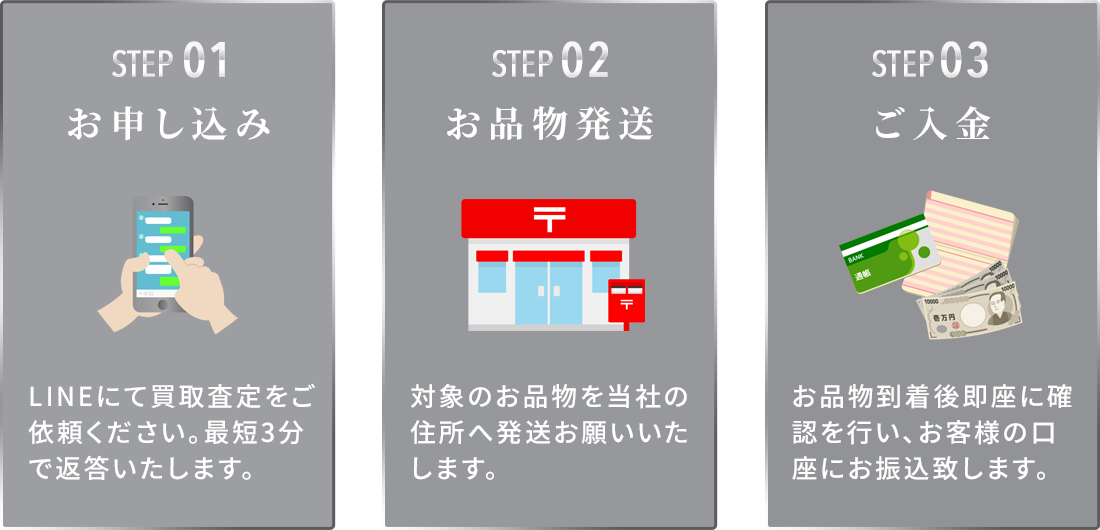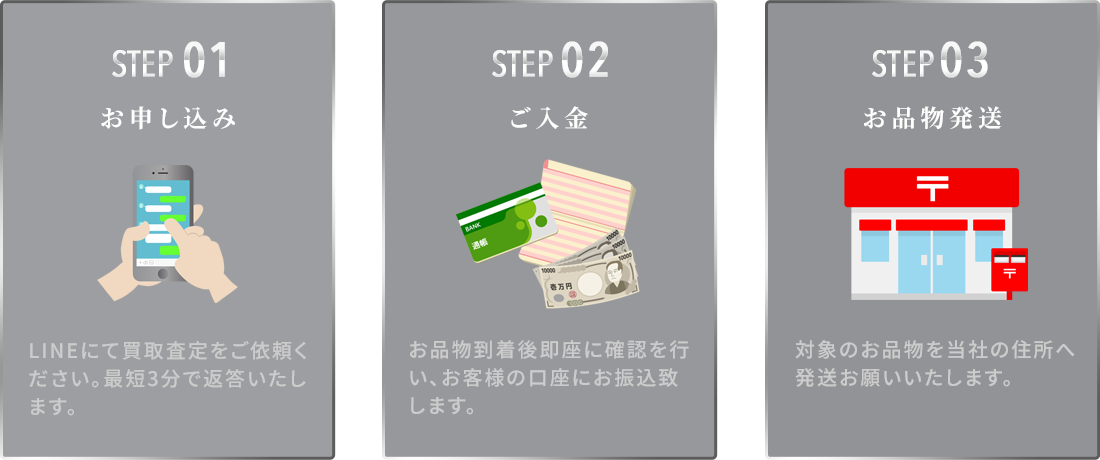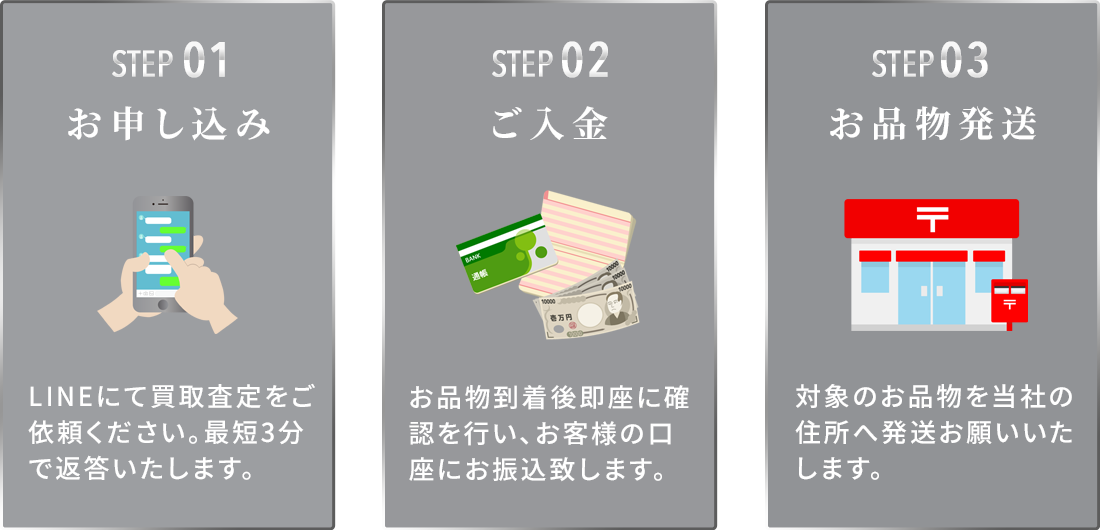 お申し込み時、当店のLINEアカウントを登録し、必要な情報を送信するだけで即日に査定結果と買取金額をご案内いたします。